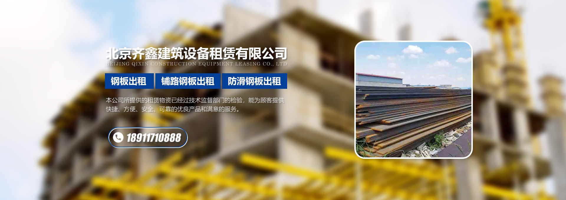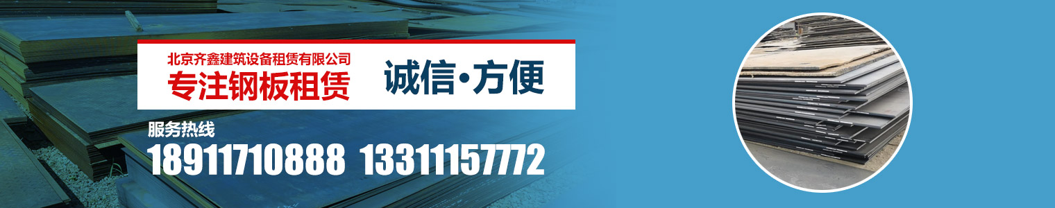 北京齊鑫建筑設(shè)備租賃有限公司是專(zhuān)業(yè)、鋼板出租、鋼板租賃、鋪路鋼板出租、防滑鋼板出租、出租鋼板。 本公司將竭誠(chéng)為各施工單位提供各種規(guī)格高強(qiáng)度墊道鋼板,使您立即擁有施工便道,加快您的工程進(jìn)度,縮短工期。本公司免費(fèi)為您提供、設(shè)計(jì)施工方案,節(jié)約您的施工成本,本公司24小時(shí)熱忱為您提供優(yōu)良服務(wù),隨時(shí)恭候您的來(lái)電!本公司所提供的租賃物資已經(jīng)過(guò)技術(shù)監(jiān)督部門(mén)的檢驗(yàn).經(jīng)過(guò)多年的經(jīng)營(yíng),能為顧客提供快捷、方便、安全、可靠的優(yōu)良產(chǎn)品和滿(mǎn)意的服務(wù)。